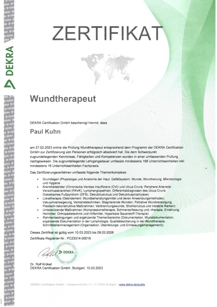 Neben seiner dreijährigen Ausbildung verfügt er über umfassende Zusatzqualifikationen im Bereich der modernen Wundversorgung und ist damit bestens auf die Behandlung komplexer Wundsituationen vorbereitet.
